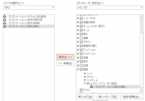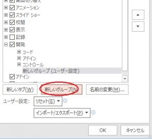 - マクロボタンをスライド上に置くことが出来ませんので、ボタン化したい場合は、ファイル > オプション > リボンのユーザー設定のダイアログを開き、新しいグループを作成します。