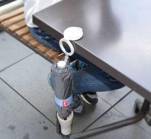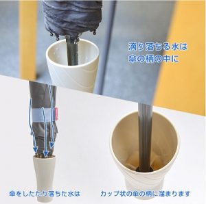 サンコーから発売中の「ハンガーアンブレラ」は、置き場所に困らない折りたたみ傘です。傘の先についたハンガー部を伸ばして、 カフェやオフィスの机に掛けられるようになっています。傘の柄の部分はカップになっていて、傘からしたたり落ちた雨水を受け止めます。 これで床がびしょぬれになる事も防げます。