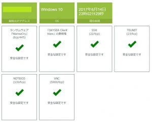 自診くんでは、TCPポート445番を利用するランサムウェア「WannaCry」や、脆弱性「CVE-2016-7836」を悪用する「SKYSEA Client View」の攻撃耐性が診断できるほか、インターネットからの直接接続を許可すべきではない22番(SSH)、23番(TELNET)、139番(NETBIOS)、3389番(RDP)、5900番(VNC)のTCPポートについても診断を行います。