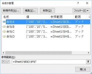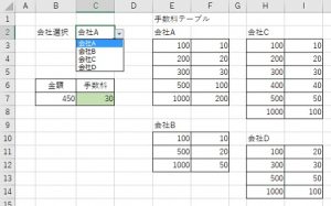 上図のような、異なる手数料体系を持った会社A~会社Dがあります。それぞれの手数料テーブルを数式タブの「名前の定義」で名前参照にします。