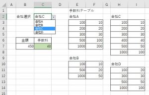 例えば、会社ごとに手数料体系(レンジと料金)が変わる場合、IF文のネストで会社名を判定して、会社ごとのVLOOKUP関数を用意するのが一般的ですが、参照先テーブルを絶対参照から名前参照にして、さらにドロップダウンリストが設定されたセルをINDIRECT関数で参照することにより、非常にスッキリしたVLOOKUP関数とすることが出来ます。