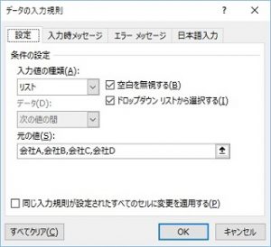 データタブの「データの入力規則」で会社選択欄を会社名(名前の定義で指定した名前)のリスト形式にします。
