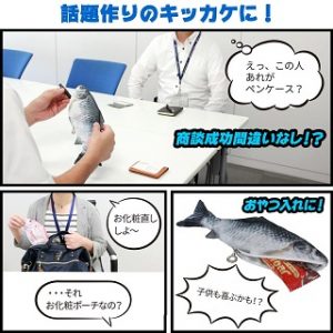 初めての商談の時に、もしこの魚をペンケースとしてビジネスバッグから取り出したら、もうつかみはOK! きっと商談も成功するでしょう。おやつ入れや、お化粧ポーチとしてもバッグから出した瞬間に、きっと場が和むはず(?)・・・もちろん時と場合によりますが。