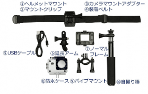 相当、最大約 30mまでの水中で使用可能)のほか、自撮り棒や、カメラを自転車やバイク、ヘルメットに装着できるマウント(カメラ固定装置)などのアクセサリ 10 点付きです。