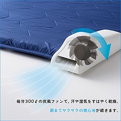 マットに東洋紡「ブレスエアー」を採用、繊維のように複雑に絡み合った立体的なスプリング構造。通気性・反発性・清潔性・耐久性に優れた高機能クッション材。体積の96%が空気層なので、ここに風を送り込み放熱します。