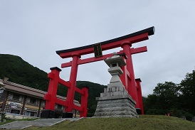 羽黒山から湯殿山までの距離は近く、9時半に出発して本宮行きのシャトルバス乗り場に着いたのが、10時過ぎでした。湯殿山には羽黒山のような大きなお社はありません。大鳥居から先の山全体が聖域となっています。しばらくするとシャトルバスが到着、出発してから5分でご神体のある本宮入り口に着きました。本宮にまつられているご神体は、周りに温泉が湧き出している巨石で、ご神体の写真撮影は一切禁止となっています。