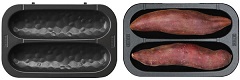 新たに開発した専用焼き芋プレートの上にサツマイモをのせると、本体上下のヒーターでじっくり包み込むように焼き、サツマイモの甘さを最大限に引き出す。サツマイモに熱が均等に伝わるよう、プレートの表面には凹凸をつけ、フッ素コーティングを施してあります。