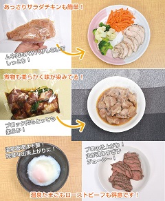 少し前から話題になっている「低温調理」別名「真空調理法」ともいわれ、通常の調理よりも低い温度で時間をかける調理法の事です。 70℃程度の温度でゆっくりと時間をかけて熱を入れると、素材のうまみが閉じ込められて、普通に調理するよりもぐっと美味しく出来上がります。