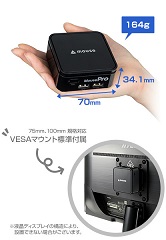 9月末に発売済みの『MousePro-C100PV』の本体のサイズはおよそ幅70×奥行70×高さ34.1mm。NUCの4分の1ほどの超コンパクトサイズで、普段パソコンの操作に使うマウスよりも小さい「てのひらPC」です。