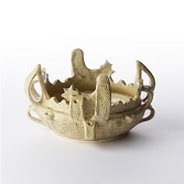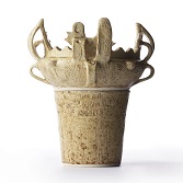 カップヌードルを作る為の容器。上部と下部に分かれ、上部をカップヌードルの蓋止めとして利用可能。国宝火焔型土器を所蔵する「十日町市博物館」公認のもと、柳宗悦・白洲正子も愛した瀬戸本業窯で制作。火焔型土器レプリカの細部や立体感を参考にし、伝統の手わざ「櫛描き」で縄文模様を表現。民藝の器の象徴である「リーチハンドル」の様式を採用。上部の火焔部分は、箸置きとして使用できるようになっています。