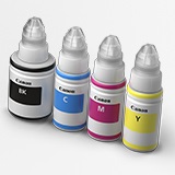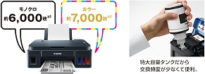 “G3310/G1310”は、特大容量タンクを搭載し、本体にブラック2本、カラー(シアン/マゼンタ/イエロー)各色1本ずつのインクボトルを初期同梱しています。大容量インクボトル各色1本(別売り)で、ブラックは約6,000ページ、カラーは約7,000ページの大量印刷が可能です。