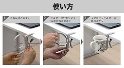 どのインテリアにもマッチする、シックなアルミデザインのカップホルダーです。デスクに挟むだけで、簡単に専用のカップホルダーが出来上がります。