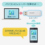 Android/iOSのスマートフォンにアプリをインストールして、Windows/MacのPCにUSBレシーバを接続して使用。スマートフォンとはBluetoothで接続されます。