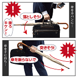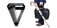 カバンを持っているときに、傘をどのようにしたら持たずに済むかを考え、“カバンと一緒に持てるようにする以外ない” と考え、カバンに取り付けるホルダーを作れば、という発想から開発し、特許取得したそうです。
