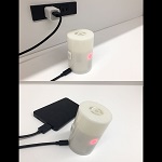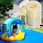 のひらサイズでコンパクトなUSB充電式空気入れ。空気を入れるだけでなく、抜く作業でも利用でき、本体にある2種類のノズル取り付け位置を切り替えて使用します。子供用の浮き輪は約15秒、ビーチボールは約20秒、簡易プールは約160秒で膨らませることができるとのこと。