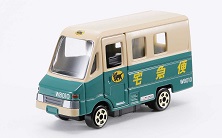 ベージュと緑色が印象的なヤマトのウォークスルー車。特徴の「歩道側から安全に乗り降りできて、運転席から荷台へ行ける」かたちを忠実に再現!スライドドアや荷台のドアも開け閉めして遊べますよ♪