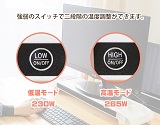 温度調節は「高温モード」と「低温モード」の2段階を手動で切り替え可能。ヒーター部周辺の温度が65℃になると自動で停止する、安全装置サーモスタット機能も搭載しています。