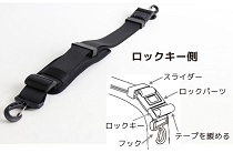 ロックパーツのPUSHボタンを押すとロックが外れ、そのまま引き上げるとストラップが伸び出ます。スライダー同士をPULLの矢印の方に互いに引き離すと、ストラップが短くなります。ロックパーツをロックキーに差し込めば完了です。