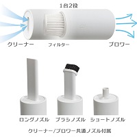 ブロワー機能を備え、本体上部は吸引(バキューム)、下部はブロワーとして利用できます。ノズルは3種類(ロング/ショート/ブラシ)付属し、バキューム部/ブロワー部どちらにも装着可能。