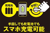 電源が確保出来ない時、電池が切れている時でも、本体のハンドルを回すことで充電出来ます。本体充電池は信頼性の高いコンデンサー充電池を採用。ニッケル水素やリチウム充電池と比較して長期保管に強く、長期保管後でも手回し充電をすれば使えるため、いざという時安心です。