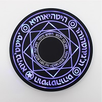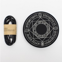 魔法陣デザインのLEDワイヤレス充電器。ワイヤレス充電対応のスマートフォンを置くと魔法陣が起動するかのように、図形や文字が次々と点灯します。本体カラーはマットブラックで、本体サイズは直径25cm×厚さ1.5cm、重量は420g。電源はmicroUSBまたは、USB Type-Cから供給します。