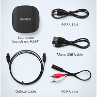 パッケージには、 Micro USBケーブル、AUXケーブル、RCAケーブル、光ケーブルを同梱。容量350mAhのリチウムバッテリーを内蔵。公称値として送信機モードで最大20時間、受信機モードで最大17時間程度の利用可能。充電の際は付属のmicroUSBケーブルを接続し、2時間でフル充電できます。
