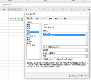PC再起動後にエクセル(Excel 2019)を起動、セルに =today() と入力、表示形式を和暦に変更すると、令和元年5月4日と表示されました。