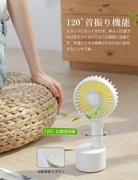 付属のスタンドに扇風機をおけば、120°自動首振り可能となります。お出掛けの時に手持ちタイプとして移動中でも扇子やうちわのように手に持って、自分に向けて優しい風を送ることができます。