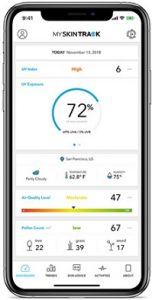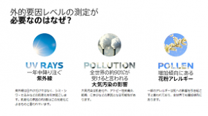 紫外線量を計測するウェアラブルセンサー。紫外線A波とB波を測定し、スマホアプリ「MY SKIN TRACK UV」で周囲の紫外線量を表示できます。紫外線データのほか、大気汚染、花粉、湿気などの外的要因のレベルも表示されるようになっています。