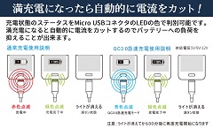 充電状態のステータスをMicro USBコネクタのLEDの色で判別可能です。満充電になると自動的に電流をカットするのでバッテリーへの負荷を抑えることが出来ます。