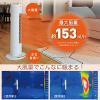 送風と温風の2つの機能を搭載したタワー型セラミックファンヒーター。エアコンと同様のシロッコファンを搭載し、最大風量は約153m3/時を実現。首振り角度は左右80度で、部屋を広角に暖めます。