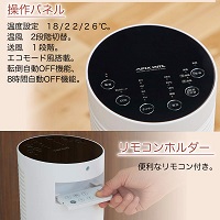 温風の風量は2段階で切り替え可能で、送風は1段階。温風の温度設定は18/22/26℃の3段階。オフタイマーは1/2/4/8時間で設定可能。消費電力は最大1,200W。また、周辺の温度を感知し自動で風量と電力を調節するECOモードを備え、電気代を節約することができます。