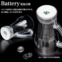 光るシリーズのグラスは他にも「光るシャンパングラス」、「光るカクテルグラス」、「光るロックグラス」があり、「光るシャンパングラス」以外は電池交換が可能です。使用電池はボタン電池CR2025 × 2枚です。