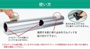 使用する前に付属のゴムパッドを取り付けます。ゴムパッドは4枚付属、ノートPC・タブレットに合わせて貼り付け場所を決めます。