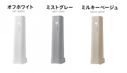 上部給水式を採用、給水が簡単でタンクを外しての給水も可能です。別売の次亜塩素酸にも対応し、冬の乾燥対策に利用できます。本体サイズは、180×210×680mm(幅×奥行き×高さ)で、重量は約2.6kg。消費電力は24W。リモコン、アロマ用スポンジ、クリーニングブラシが付属します。カラーはオフホワイト、ミストグレー、ミルキーベージュの3色です。