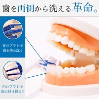 内側の青のブラシで歯の大部分を洗い、外側の白のブラシで歯の付け根を磨きます。2つのブラシが両側から歯にしっかり当たることでいつも通り磨いているだけなのに2倍速で素早く同時にキレイにすることができます。