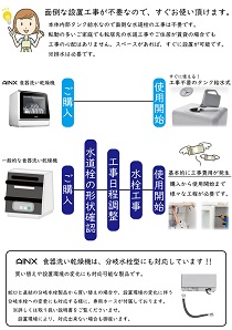 本体内部タンク給水なので面倒な水道栓の工事は不要です。転勤の多い家庭でも転居先の水道工事や住居が賃貸の場合でも工事の心配はありません。スペースがあれば、すぐに設置が可能です。 ※排水は必要です。