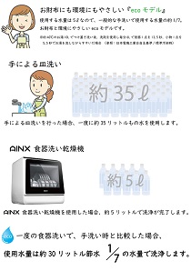 使用する水量は5リットル、手洗い時の1/7。標準洗浄モードで1日2回使用で1ヶ月の電気使用料金はわずか約1,463円です。AINX食器洗い乾燥機は、分岐水栓型にも対応しているため、買い替えや設置環境の変化にも対応可能です。