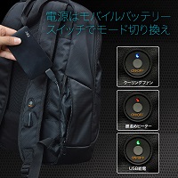 リュックのショルダーベルトにはUSBポートがあるため、いつでも手軽にスマホの充電を行うことができます。背面パッドからの風を送るクーリングファン、ショルダーストラップのUSBポート、腰を温めるヒーター。 これら3つの動作モードの電源は、モバイルバッテリー(別売り)を使います。 そして、電源ON/OFFと、3つの動作モードの切り換えを行うスイッチは、ショルダーストラップにあります。