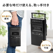 収納式の取っ手が付いた持ち運びやすいカセットプレーヤー。乾電池またはACコンセントで稼働するため場所を選ばず使えます。USB Type-Aポートを搭載、カセットテープの再生だけでなく、USBメモリ内のMP3音源も再生可能。容量32GBまでのUSBメモリに対応します。