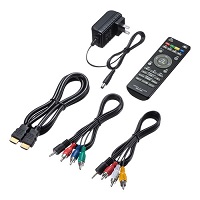 本体サイズは120×90×27mm(幅×奥行き×高さ)。重量は約116g。ACアダプタ、HDMIケーブル、RCAコンポジットケーブル、専用コンポーネントケーブル、リモコン、単四形乾電池2本が付属します。