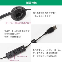 相手の声を聞き取りやすくすることに特化した「モノラルタイプ」のUSBヘッドセットです。一般的なマルチメディアヘッドセットと呼ばれるものは、左右のスピーカーから異なった音が出力されるステレオ音声タイプとなっており、これは音楽や映像を楽しむのには適しますが音の奥行き感や立体感が会話の邪魔になる場合があります。