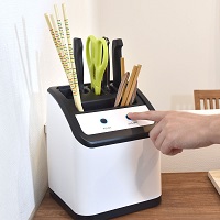 最大5本までの包丁やナイフ、料理ハサミと、お箸やスプーン、フォークなどのカトラリーも 乾燥とUVライト照射可能です。サイドには便利な電動砥石付きだから、いつでも包丁の切れ味を保つことができ、サビつき予防にもなります。