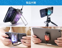 三脚固定用の1/4ネジ穴が付いているため、三脚や雲台に取り付けることが出来ます。背面のスタンドを起こすと、スマホを挟んで立てかけて使用することも出来ます。