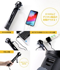 停電時にスマホの充電が切れてしまったとき、2,000mAhのモバイルバッテリーとして、スマホなどのデジタル製品の充電が可能です。 USB充電はもちろん、手回しでも発電・蓄電が可能です。さらに、脱出が必要な緊急事態やアウトドアに使えるカッター・ハンマーも付いています。