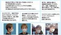 水での手洗いを推奨しております。洗濯の際は色うつりの可能性がありますのでご注意ください。呼吸が苦しい場合や睡眠中は着用しないでください。乳幼児や呼吸器に異常がある方は使用しないでください。