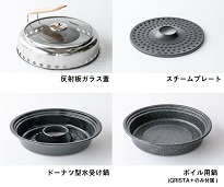 水受け鍋、スチームプレート、ボイル用鍋(GRISTA+のみ付属)が付属し、組み合わせ次第で焼く、煮る、蒸す調理が可能な鍋。フタの裏側に陶器製のプレートが仕込まれていて、輻射熱を発生させます。火による下からの熱と、陶器プレートに反射させた上からの熱で、ムラなく加熱する点が特徴です。