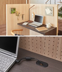 仕切りにはフックなどが掛けられる有孔ボードを採用し、様々なアレンジが可能。色は、同社の内装ドアや床材とのコーディネートが可能な、落ち着いた木目調を採用。仕切り部には、明るいリビングに馴染む「ライトナチュラル柄」と、グレイッシュカラーをとり入れた「ミディアムグレー柄」の2種類。