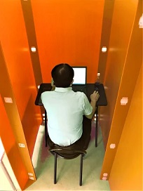 ネットカフェのように周囲との接触を遮断する閉鎖空間を簡単な組み立てで作成可能。6枚のパネルをジョイントで連結させる仕組みで、入口は左右どちらにも組み立てられます。