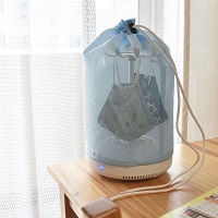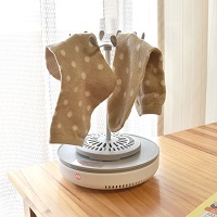 直径17cm×高さ24cmと卓上にも置ける小型乾燥機。本体フックに乾かしたいものをセットし、カバーフードを閉じて使用します。土台から温風を噴出し、庫内温度を約70℃にして乾燥を行ないます。室内干しした場合に比べて、4分の1の以下の時間で乾燥できます。